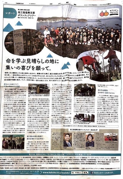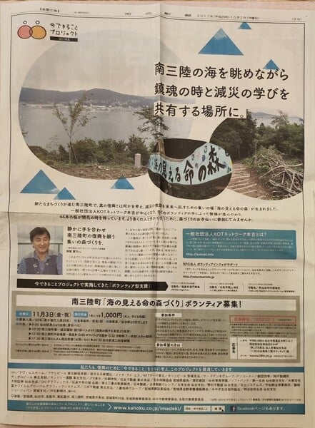 東日本大震災で被災した宮城県本吉郡南三陸町の町民有志による『海の見える命の森』は2016年にスタートしました。この森は我々が本震災を通じて『学んだ事』『後世に伝えねばならない事』『祈りたい事』『残したい風景』を伝える場所として整備を開始しました。