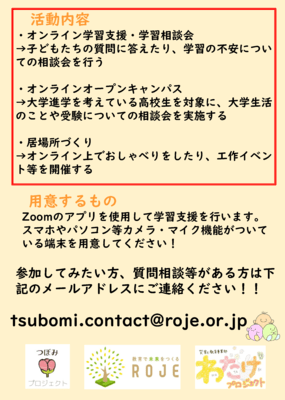 また、そういった「学習」に対する支援だけでなく、「オンラインオープンキャンパス」などの企画を通して「大学生だからこそできる」情報発信の場としていくことや、工作イベントなどの開催によって子どもたちに「居場所」を提供することに繋がると考えています。