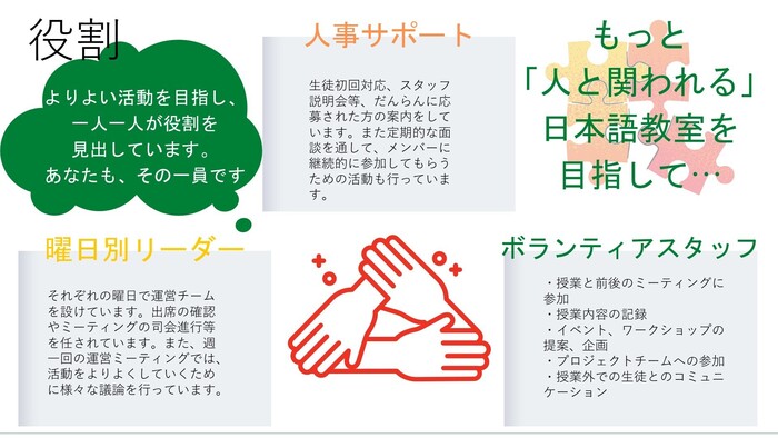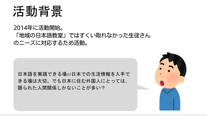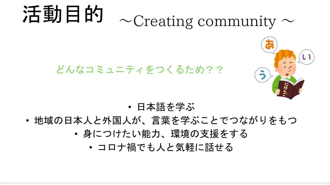 仕事や勉強で日本に来ている外国人が、日本でやりたいことにチャレンジできるために必要な日本語の勉強と仲間づくりができる日本語教室を運営しています。