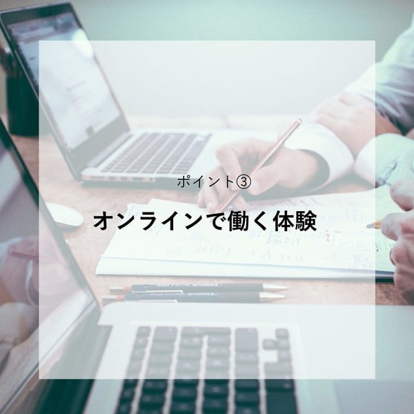 ●オンラインで企業で働く体験インターンシップ期間中は、基本オンラインで行います。企業の就業時間に合わせて、企業の方と一緒にテレワークを行いますので、働く経験にもなります。朝の朝礼や課題確認、時間を決めてのオンラインMTGで企業の方からアドバイスをもらいながら企画を進めるなど、社会人になった後の働くイメージをつけることができます。