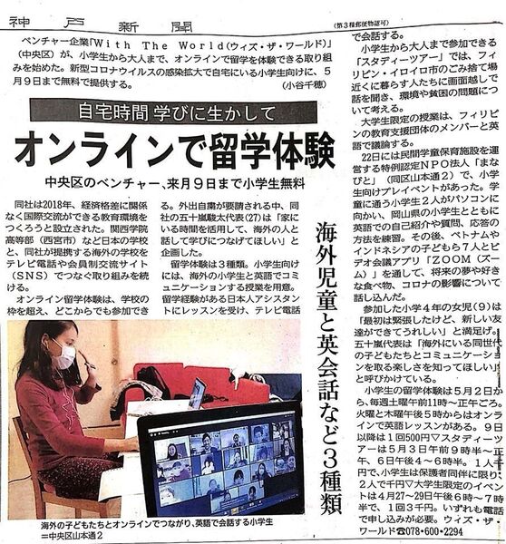æ¥æ¬ã®åŠæ ¡ã«ããªã³ã©ã€ã³Ãåœé亀æµÃæ¢ç©¶åŠç¿ãã®With The Worldã®ããã°ã©ã ãç®æããŠãªã³ã©ã€ã³ã§å¶æ¥æŽ»åãè¡ããŸããã