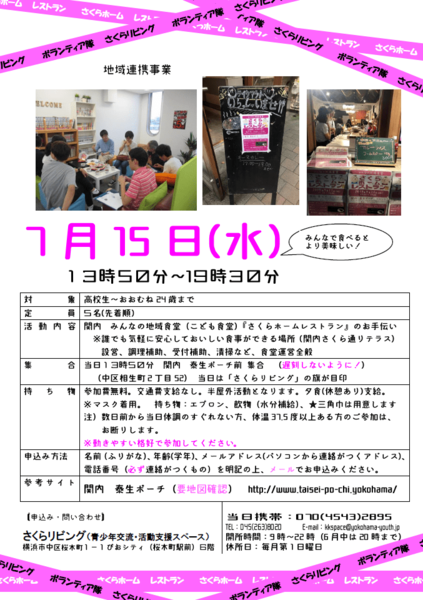 関内まちづくり振興会が運営する、みんなの食堂(こども食堂)「さくらホームレストラン」のお手伝いを通して、青少年の社会参加のきっかけと地域のつながりを体感します。(注)写真は昨年度の「野毛こども食堂」。