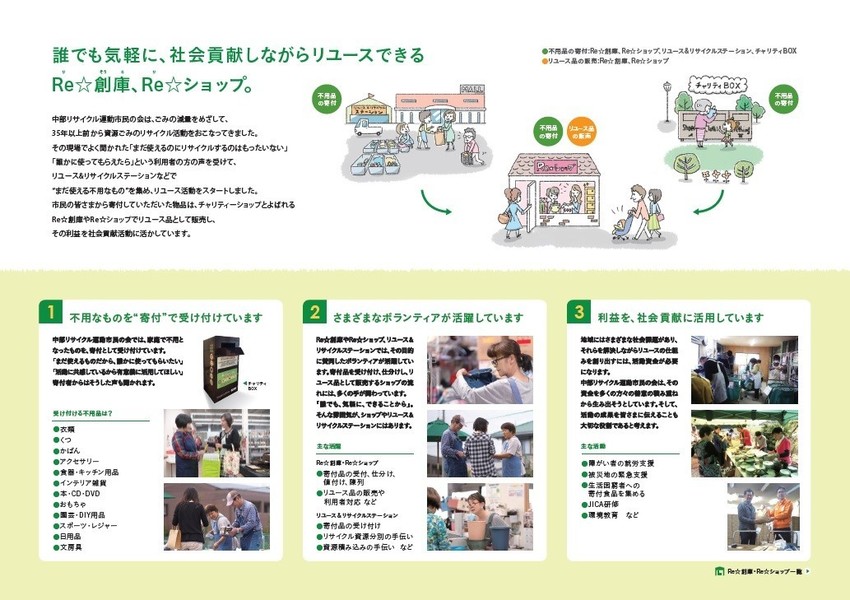 「Re(り)☆ショップあつた」は皆様からご寄付いただいた不用品を販売・リユースして、その利益を環境保全・社会貢献活動に役立てるチャリティーショップ。環境問題に関心がある人、一緒に活動しましょう!