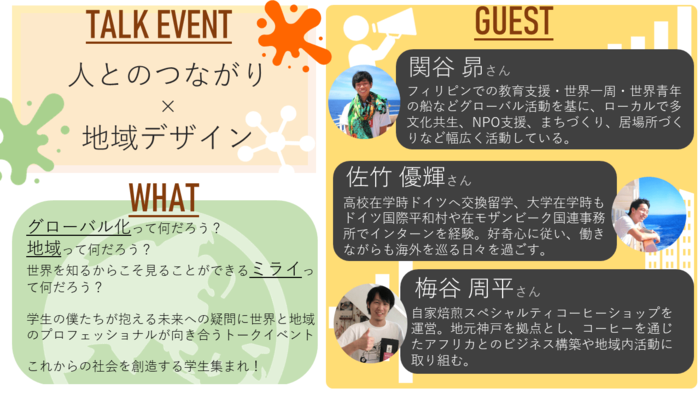 福島の高校生と兵庫の大学生が企画したオンライントークイベント!海外での経験を元にグローバルな視点を持ちつつ地域で活躍する3名のゲストを迎え、人とのつながり×地域デザインのテーマを一緒に考えます!