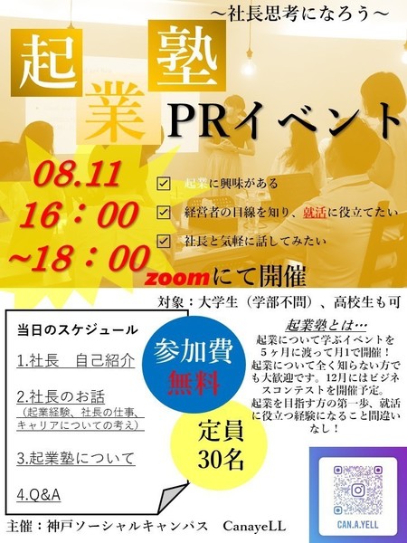 今回のイベントは、「起業塾」に少しでも興味のある方が、「起業塾」の雰囲気を感じられるものになっています。また、今回のイベントだけの参加でも社長と接することでキャリアに対する視野が広がると思います。「起業塾」や今回のイベント参加にあたって、起業についての特別な知識は全く必要ありません。「起業に少しでも興味がある」方や「働き方や雇用の変化に不安を持っている」方、「起業塾やビジネスコンテストに興味のある」方などにはぴったりのイベントです。オンラインでの開催なのでご自宅から気軽に参加可能!Q&Aコーナーでは社長に直接質問をぶつけてもらうこともできます。少しでも興味がある方はぜひ一度、ご応募ください!詳細については下記ポスターをご覧ください。