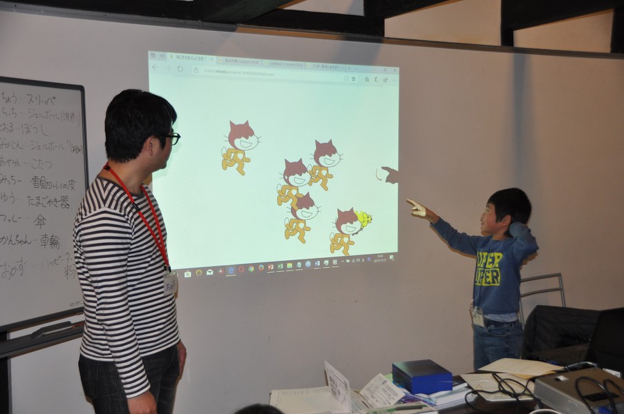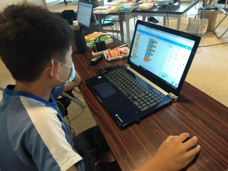 プログラミングツール「scratch」を使います。プログラミング「言語」を覚えるのではなく、さまざまなチャレンジ・失敗を通して考えるチカラをつけてほしいと願って取り組んでいるボランティア活動です。