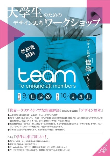 【プログラムの特徴】「デザイン思考」は、シリコンバレーの各企業や日本でもYahoo!JAPAN、任天堂などさまざまな会社が取り入れている課題解決のマインドセット。就職活動でも注目されています。 ★大学生のうちにこれをみにつけておけば、さまざまな場面で役立ちます! さまざまな大学の学生とともに「世界一クリエイティブな問題解決」方法として話題の「デザイン思考」を学んでみませんか? 〇 大学生だから取り組めるチーム型のワークショップ「デザイン思考」 〇 「デザイン思考」は、シリコンバレーのスタートアップ企業をはじめ世界各国のIT企業やグローバル企業がこぞって取り入れる「課題解決の新しい手法」(アートやイラストという意味の「デザイン」ではありません) 〇 社会課題の解決、ビジネス、新しい商品・サービスの開発まで、あらゆる場面で必要とされる「デザイン思考」を学び、グループワークやフィールドワークで実践します。今後のキャリアに役立ちます。 〇 さまざまな大学の学生が参加します(無料)