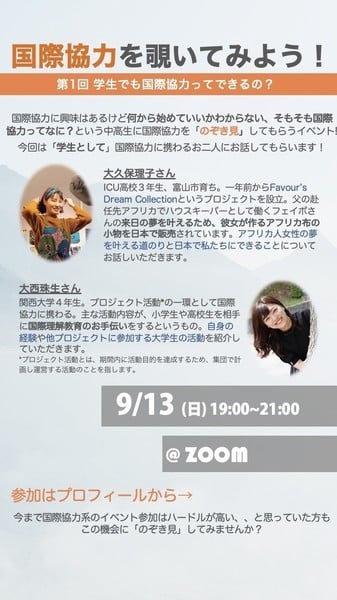 国際協力に興味はあるけど何から始めていいか分からない、そもそも国際協力ってなに?という中高生に国際協力を「のぞき見」してもらうイベント!今回は「学生として」国際協力に携わるお2人にお話ししてもらいます