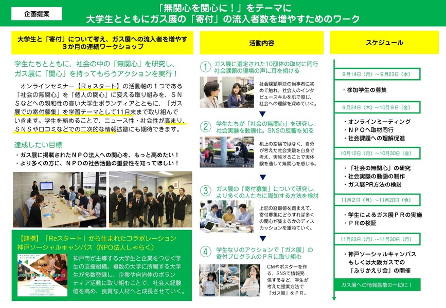 今回は連動している企画として、大阪ガスが新しくスタートする寄付プログラムがあります。学生の皆さんも実際に社会課題解決に取り組むNPO法人への取材に同行することもできますし、動画編集のレクチャーも考えています。もちろん、大企業が進めていく「寄付」が実際にどういう流れで進んでいくかも真横で見守ることも可能です。