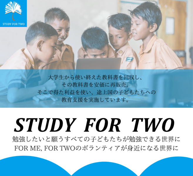STUDY FOR TWOは勉強したいと願うすべての子どもたちが勉強できる世界を目指す、大学生による活動です。大学での中古教科書回収販売事業を通して、途上国の子供たちに支援プログラムを届けています