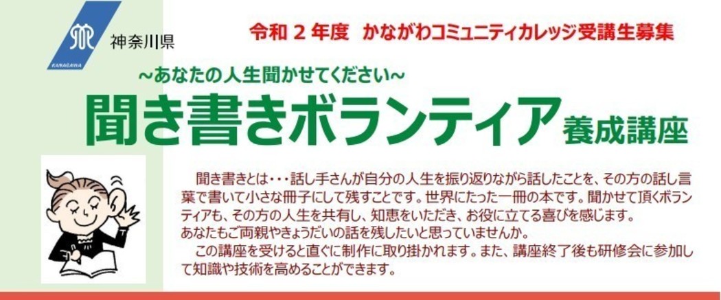 聞き書きとは・・・話し手さんが自分の人生を振り返りながら話したことを、その方の話し言葉で書いて小さな冊子にして残すことです。詳細は、かながわコミュニティカレッジ まで。