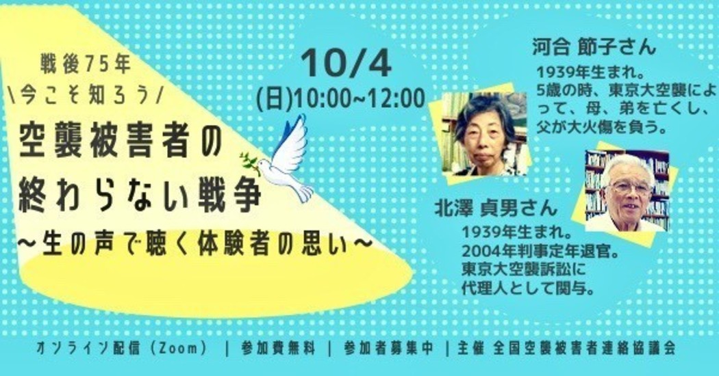 太平洋戦争末期、東京大空襲でご家族を空襲で亡くされた河合節子さんから体験談を伺います。また、空襲被害者には戦後、国から一切救済の手は差し伸べられませんでした。その問題についても弁護士から解説します。