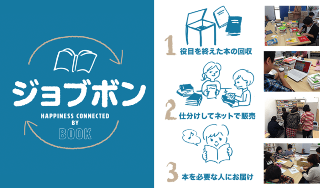ジョブボンとはJOB(仕事)+本の造語です。役目を終えた本を回収し、障害者就労施設で再生、ネット販売を通じて、再び必要な方のお手元に届けます。