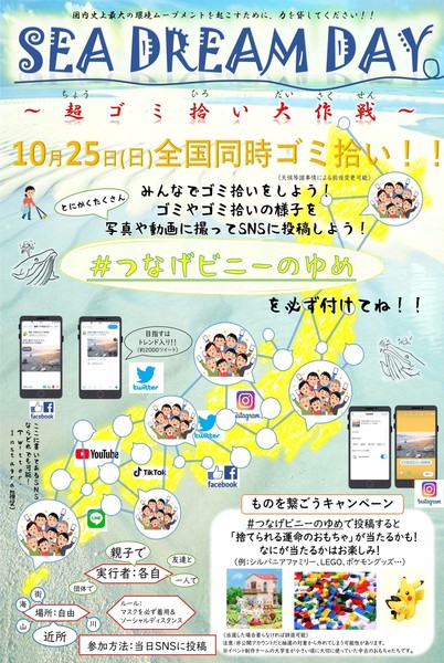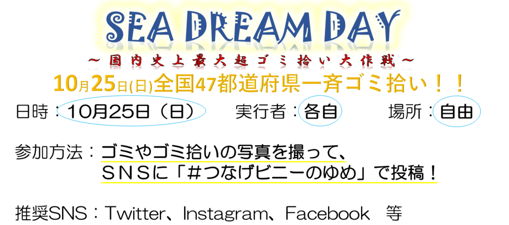 10/25は、SEA DREAM DAYです。全国各地で一斉にゴミ拾いイベントが行われます。このイベントは個人での参加も可能ですが、全国各地で拠点ゴミ拾いイベントを開催します。その全てで「#つなげビニーのゆめ」をつけてゴミ拾いの様子やゴミの写真をSNSにアップします。そして全国各地のゴミ拾いをオンラインで繋げて、1つの大きなムーブメントを創ります。