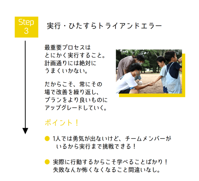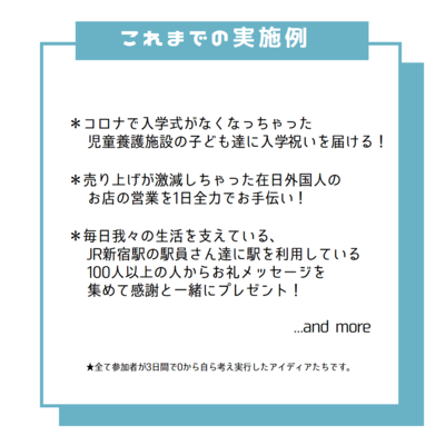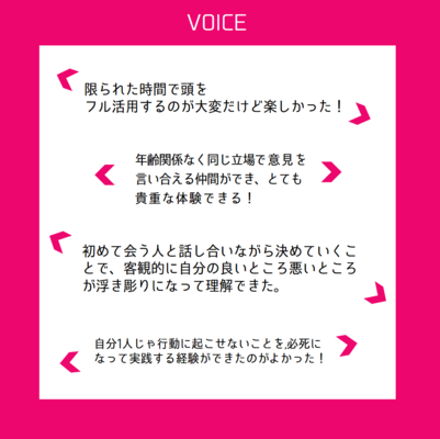 「参加の前までは「何でも成功させなければならない」と思っていましたが、参加して活動している中で「今は失敗してもいい!逆に失敗も他の視点から見たら成功だ!」と思えるようになりました。その面で、グループのメンバーの助け合いや声のかけ合いは本当に支えになりました。」