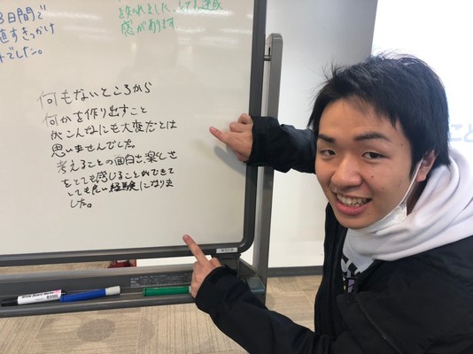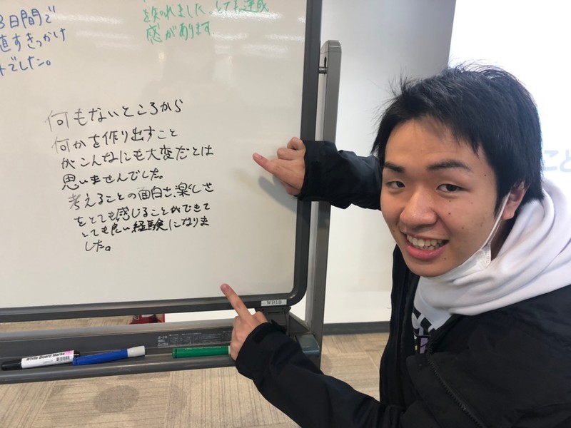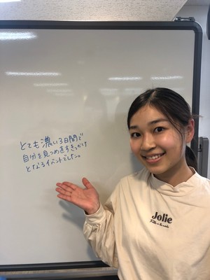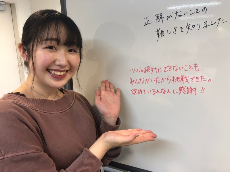 「1番の学びは、何事にも目的とゴールを明確に持つことが鍵だということです。今回の企画だけではなく、就活や自分の人生プランにも活用できるので、とても大きな学びになりました。参加前は、自分のできること範囲内でしか行動ができていませんでしたが、3日間の活動を通して、グループワークの楽しさやできないだろうと思うことに挑戦してみると意外とできたことが多く、失敗に対して恥ずかしさや嫌だなと思わなくなったと感じています。」