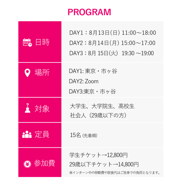 ・インターン中の移動費や飲食代はご自身での負担となります。