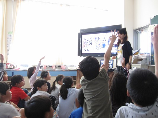 2時間目は大きなスクリーンで作品をみて対話をしながら鑑賞します。お友だちの意見をよく聞いて、自分の考えを発言していくことにチャレンジします。
