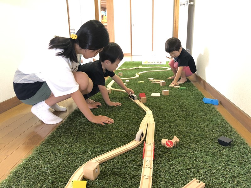 通路に芝生を敷いて自由に遊べるエリアを生みだします。ゴロゴロしながら過ごせる場をつくろう!