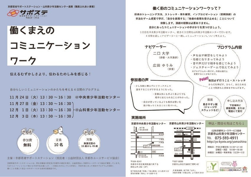 11/24(火)京都市中央青少年活動センター、11/27(金)京都市山科青少年活動センター、 |