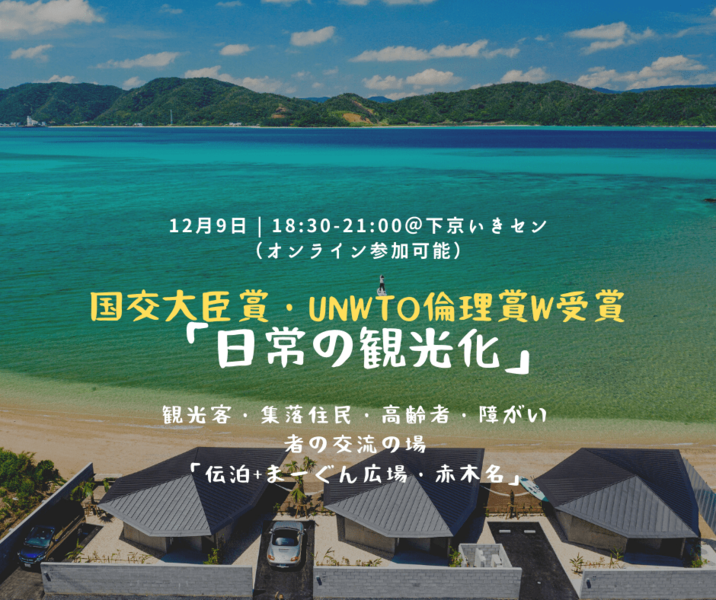 2日目には、2020年に国交大臣賞を受賞した、観光客・集落住民・高齢者・障がい者が集い多種多様なコトを作るための場づくりを行っている「伝泊+まーぐん広場・赤木名」から誰一人取り残さないインクルーシブな観光まちづくりの仕組みと工夫について学びます。