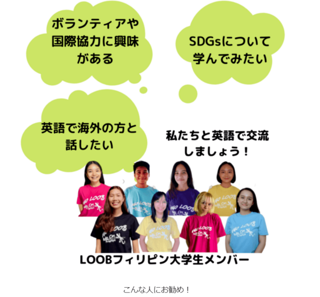 これまでフィリピン・イロイロ市で2,800人以上の国際協力ボランティアを受け入れてきたNGO LOOBが、国連の持続可能な開発目標(SDGs)を軸に、オンラインで【知る】から【行動する】機会を提供しています。