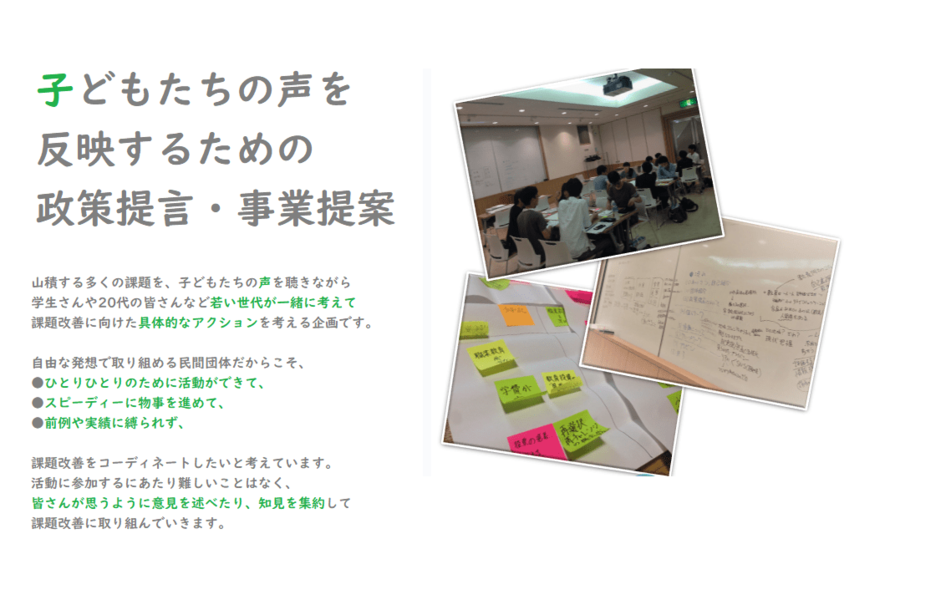 これまで、子どもたちをバックアップサポートしたり、子どもの声を反映するための組織や仕組みは、生徒会・児童会などが存在するものの、学校管理下である場合がほとんどで、「子どもたちが自主的に自由に意見交換できる場ではない」という声も届いていました。