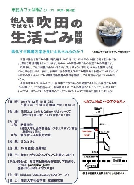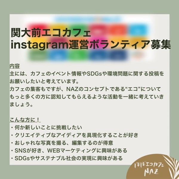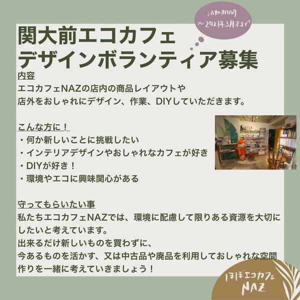 - エコカフェNAZ(ナーズ)の企画・運営スタッフを募集します。