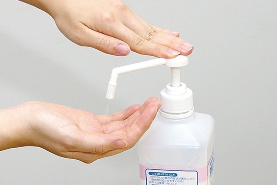 外出先においてある消毒液。押す部分の衛生面の向上という着眼点から、市販の消毒液に装着するだけで「ひじで押せる」ようになるグッズの作成を開始しています。完成後は、市役所や小学校、図書館などの施設に無料で配布しようと考えています。