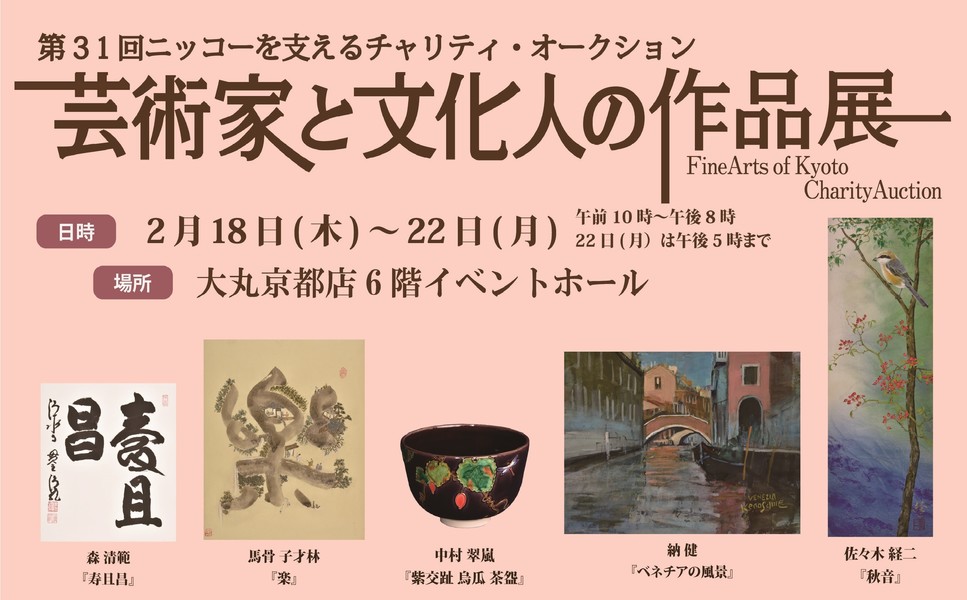 | 第31回チャリティーオークション「芸術家と文化人の作品展」は、茶道三千家の家元や、京都を中心に活動されている日本画家、洋画家、陶芸家、そして関西の代表的な寺院の宗教家の方々よりご寄贈いただいた芸術作品、及び芸能関係者などから寄贈いただいた作品の展示・入札会です。この収益は、必要経費を除きすべて、当会を後援する公益財団法人 日本国際民間協力会(NICCO)に寄付され、シリア難民の人道支援事業やインド、ケニアでの衛生改善・農業支援事業などとして活用されます。 本オークションは主に20代学生が中心となって運営しています。事務局員一同、皆さまのご参加お持ちしております。 ボランティア内容は主に以下2点です ① 会期前(17日):美術品の運搬、展示補助 ② 会期中(18~22日):会場にて案内やチラシ配り、会場内監視など なお、新型コロナウイルス感染拡大状況によっては上記内容を変更する場合がございます。 2月13日にボランティア事前説明会を開催予定です。 日本国際民間協力会(NICCO)本部で行います。Zoomも繋げながら行うのでご自宅からも参加可能です。 また、当日参加できない場合は個別に対応しますのでその旨をお伝えください。 |