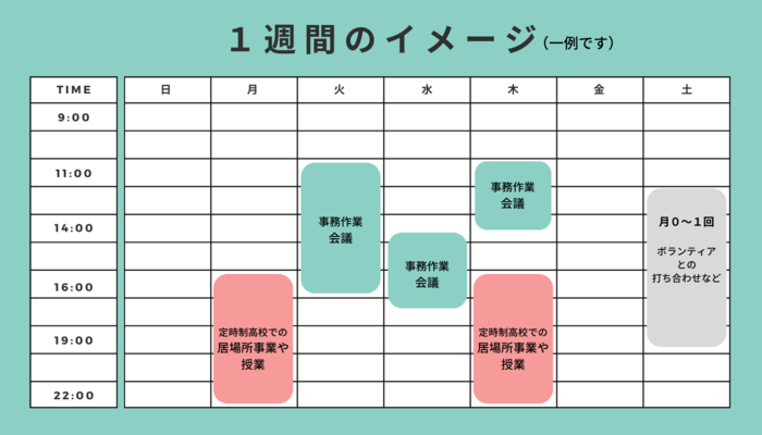 ※高校生ひとりひとりにあわせたイベントや施策の立案実施、授業の進行、生徒ひとりひとりの対応、ケース会議、プログラム作成に関わる会議運営、運営にかかる書類作成、食事提供者を含む地域の人、学校の先生、社会人ボランティアなどの人とのコミュニケーションを含みます。