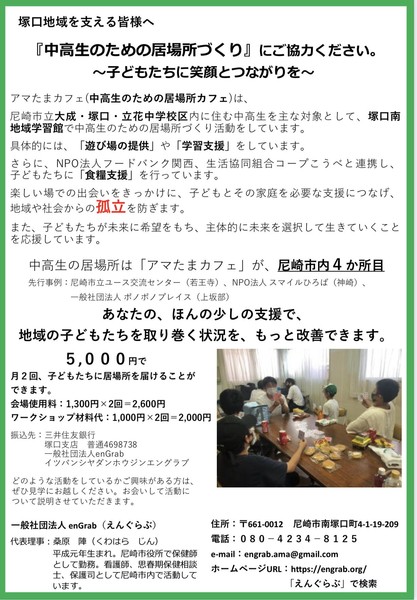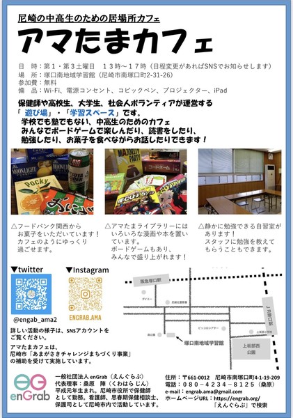 中高生の居場所づくり事業では、「アマたまカフェ(Twitterアカウント:@engrab_ama2)」という名称で、月2回、原則、第1・3土曜日(午後1時~5時)に塚口南地域学習館(尼崎市南塚口町2丁目31-26)で活動をしています。中高生が気軽に立ち寄れる遊び場です。子どもたちとお菓子を食べながら、ボードゲームなどをして楽しんでいます。学習支援も行います。対象は、尼崎市立大成中学校の生徒を中心に、近隣の尼崎市立立花中学校・塚口中学校、尼崎市立尼崎高等学校・尼崎双星高等学校、兵庫県立尼崎北高等学校、兵庫県立尼崎小田高校、及び園田学園中学校・高等学校の生徒です。