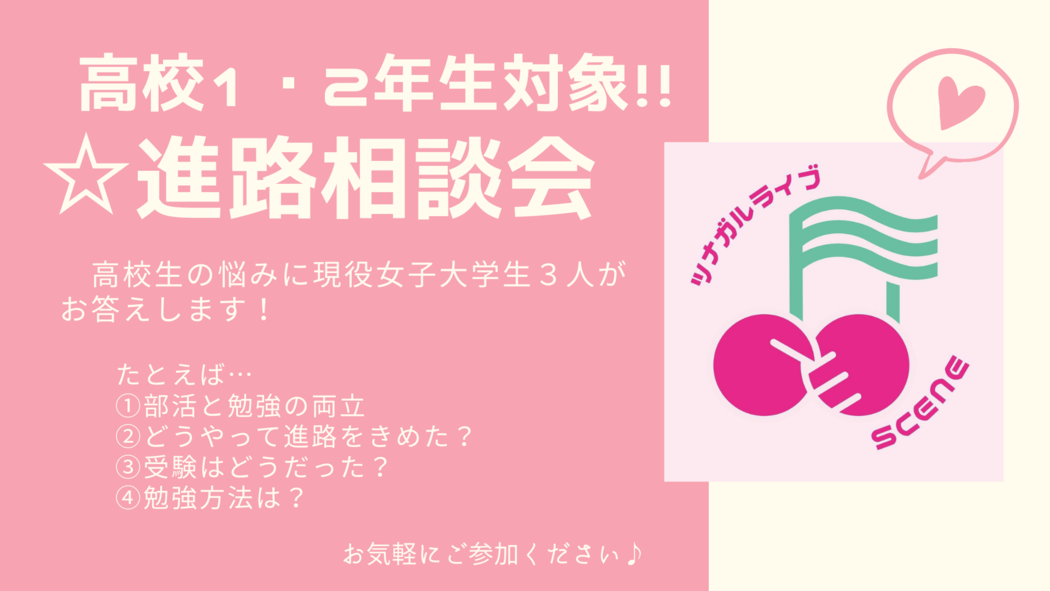 学生オンラインライブ企画・編集チームSCENEが主催する、ライブ前交流会第一弾!今回は、進路や勉強の悩みを持った高校1,2年生に現役女子大生3人組が答えます!ざっくばらんにお話ししましょう!
