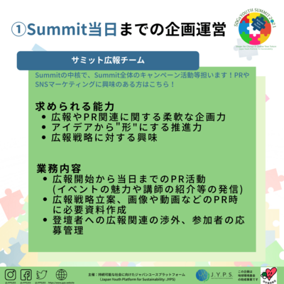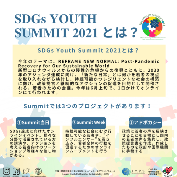 JYPS主催で2021年6月上旬に若者による若者のためのイベントである「SDGs ユースサミット2021 ~ REFRAME NEW NORMAL; post pandemic recovery for our sustainable world ~ 」を開催にさいし、共にユースサミットを企画・運営し盛り上げてくださる日本の若者の皆様を募集します!!!😃⭐️