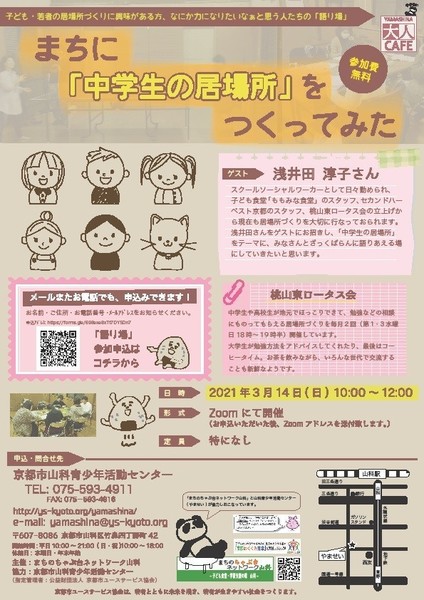 今回は、スクールソーシャルワーカーとして日々勤められ、こども食堂「ももみな食堂」スタッフ、セカンドハーベスト京都スタッフ、桃山東ロータス会の立上げから現在も居場所づくりを大切に行なっておられる「浅井田淳子」さんをゲストにお招きし、「中学生の居場所」をテーマに開催します。