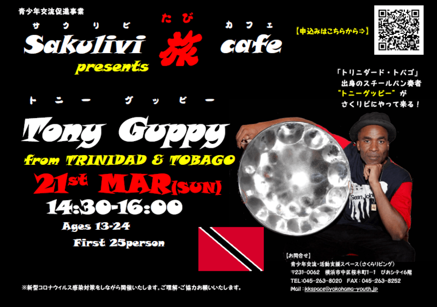 トリニダード・トバゴ出身のプロスチールパン奏者「トニー・グッピー」がお国の話や、演奏をしてくれます!