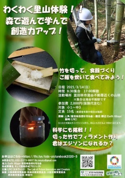 内容:里山で竹(高学年以降で林業者のOKが出れば木も可能)を管理伐採する林業を体験。切った竹を使って、竹で食器を作り、ご飯を炊いて皆でおにぎりを食べます。そしてエジソンが京都の竹で白熱電球を成功させたのは歴史的にも有名な話ですが、今回その竹フィラメントに手作りで挑戦します。SDGsにつながる【持続可能な山林管理】についてもお話を聞くことで、人間が自然の恵みをいただきながら共生することに気づき、考えてもらえるような企画となっています。
