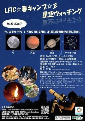 内容:冬から春に移り行くこの季節の星空を観察し、宇宙と自分たちの関係を探究してみましょう。それ以外にも原始時代の火起こしで晩御飯の準備に挑戦したり、小麦粉をこね生地からピザを作ったり出来ます。それぞれの体験を通じて、自然との調和・SDGsに繋がる「持続可能な社会の営み」を感じ考えます。子ども達の各々の役割分担やコミュニケーション能力向上を目指す、楽しいプロジェクト型・探究イベントです。