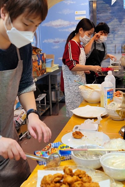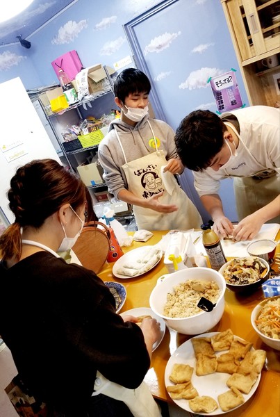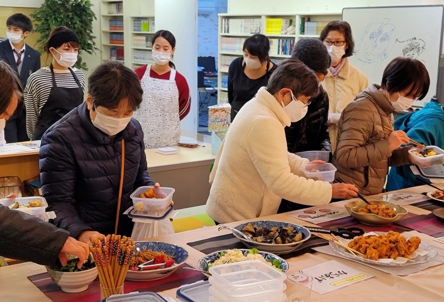 地域の人たちが買い過ぎた食材や消費期限切れが近い食材を持ち寄り、私たちが調理し1g1円のおばんざいとして販売しています。