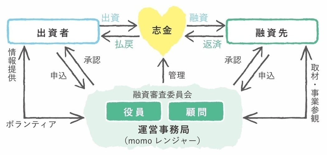 私たちコミュニティ・ユース・バンクmomoは、みなさまから集めた出資金を原資に、NPOや社会貢献事業などの地域課題を解決する事業を行う個人・団体へ『融資』(お金を貸す)をしています。