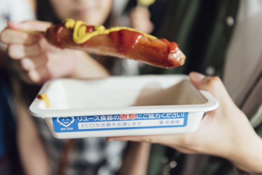 使い捨て食器の代わりに、繰り返し何度も洗って使用出来る食器を導入し、具体的なごみ減量、地球温暖化防止を計る仕組みです。宵山行事に出店する露店商さんのお持ち帰り商品以外の食器はすべてリユース食器となります。
