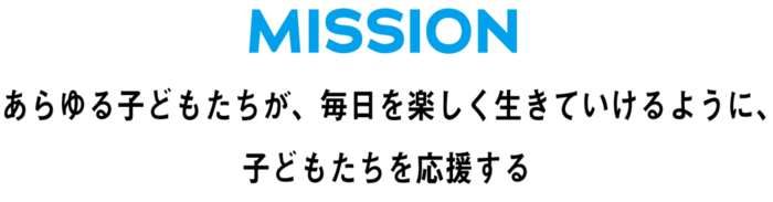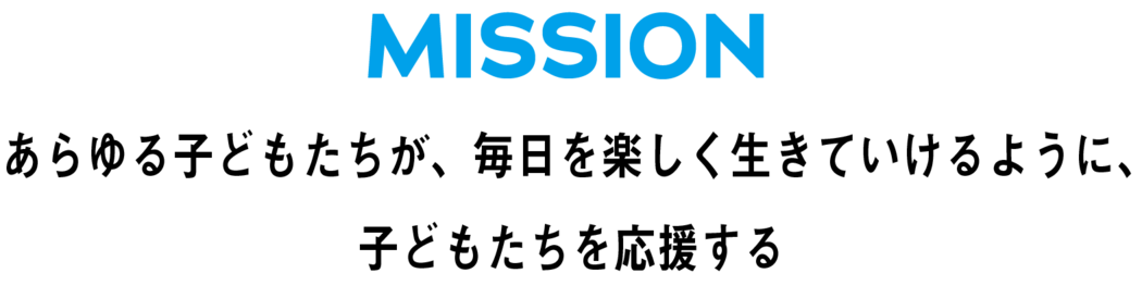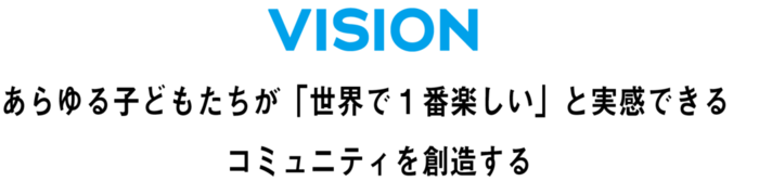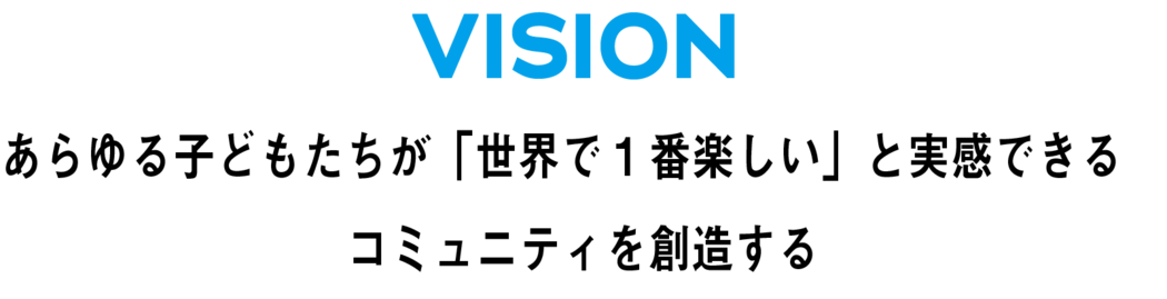 私たちは「あらゆる子どもたちが、毎日を楽しく生きていけるように、子どもたちを応援する」をMISSIONとし、「あらゆる子どもたちが世界で1番楽しいと実感できるコミュティを創造する」をVISIONと掲げています。