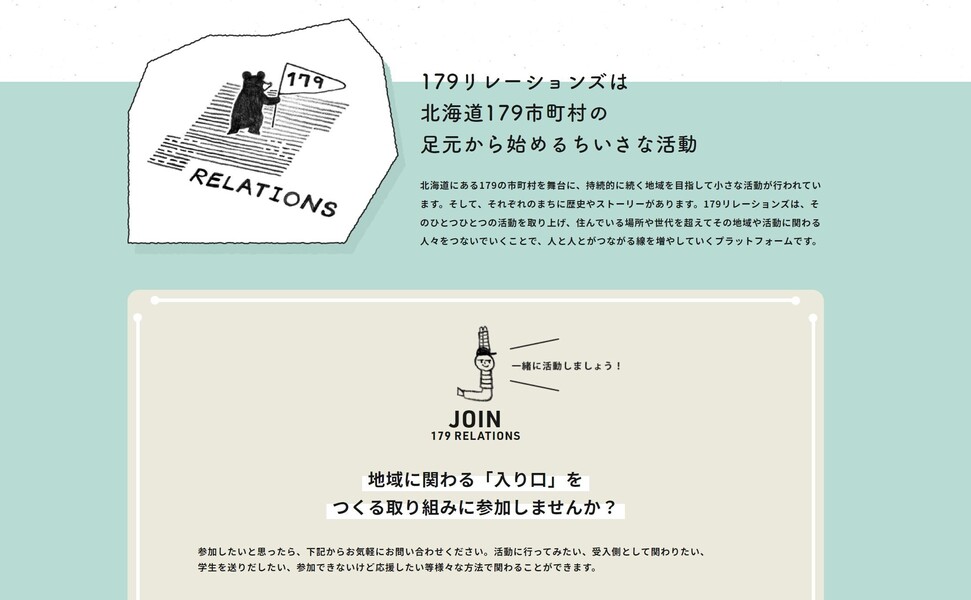 北海道にある179の市町村を舞台に、持続的に続く地域を目指して小さな活動が行われています。そして、それぞれのまちに歴史やストーリーがあります。179リレーションズは、そのひとつひとつの活動を取り上げ、住んでいる場所や世代を超えてその地域や活動に関わる人々をつないでいくことで、人と人とがつながる線を増やしていくプラットフォームです。北海道各地の地域に密着した小さな活動の活動方向や活動している人々のインタビューなどを掲載しています。