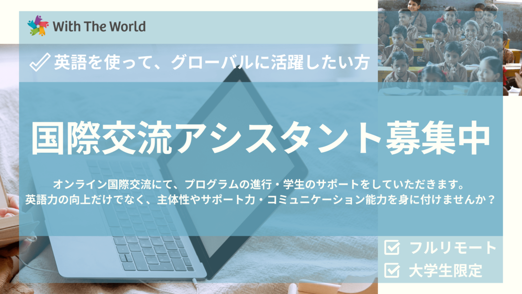 - 【11/30〆切】大学生の方大募集中!!オンラインでの国際交流のアシスタント!