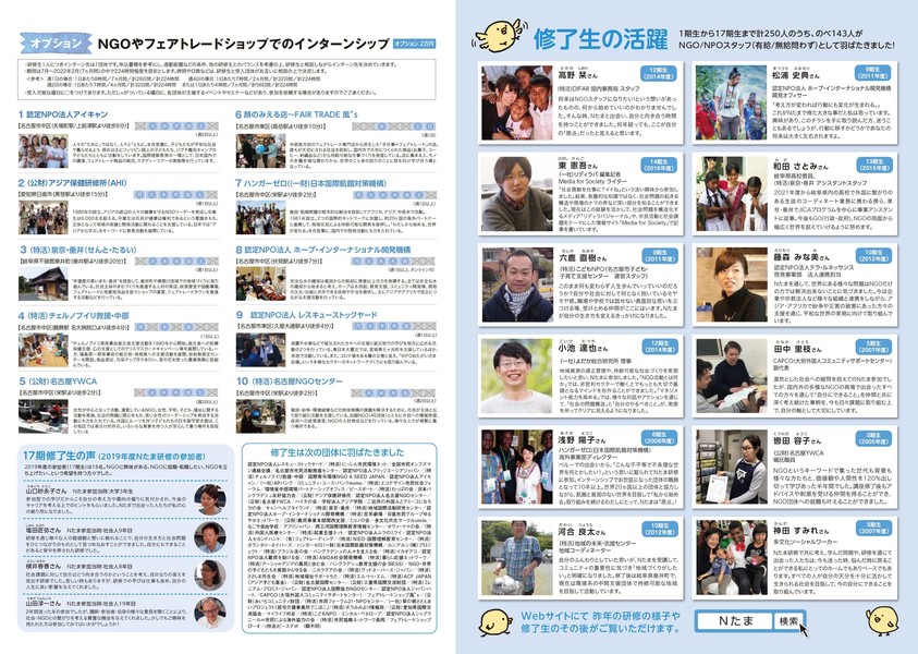 半年間のかけてNGO/NPOスタッフを育成するカレッジ。2002年よりスタートし、18年間で研修を受けた「Nたま」は250名。このうち143名の卒業生が、NGO・NPOの担い手として活躍しています。