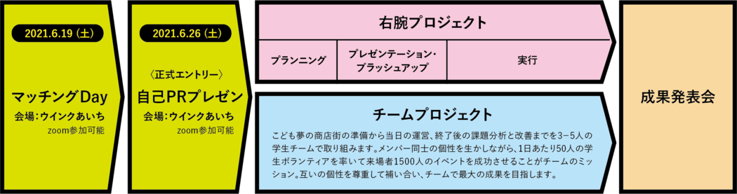 地元でまちづくりをしてみたい、自分が作ったアプリを多くの人に使ってもらいたい、小学生の課外活動を企画したい、営業力を試したい・・・。事業の目的・課題とあなたの興味関心と能力・知識とが重なったもの、それがあなたが取り組む"右腕プロジェクト"です。あなたにあったフィールドであなたの力を存分に発揮してください。他のインターン生とチームで取り組むこともできます。