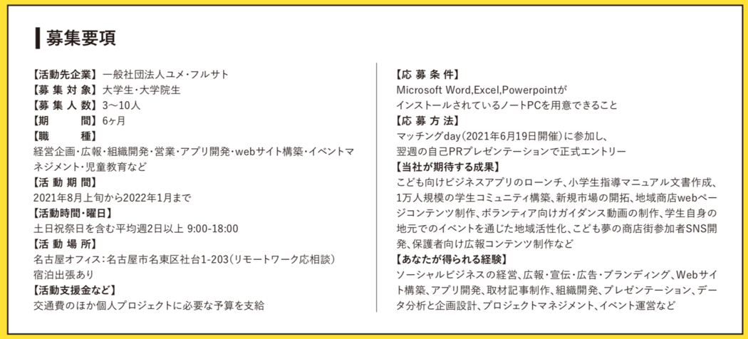 交通費とは別に個人プロジェクトに必要な活動費(目安:2万円/月)を支給します。詳しくはマッチングDayでお伝えします。  |