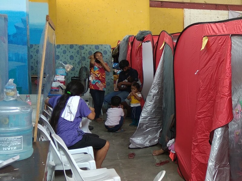 避難所には各家庭にテントが用意され、いちおう感染対策は行われていますが、それほどしっかりしたものではなく、クラスターの発生も危惧されます。また、そもそもひとつのテントで暮らすひと家族の人数が多いですし、テント内はとても暑いので、人々はやはり表に出て過ごしています。