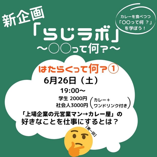 ラージクマールさんのインターン生が中心となって企画した「はたらくって何?」というテーマのらじラボ第1回。今回は、サラリーマン→カレー屋という珍しい経歴をお持ちのラージクマールの店主けんさんが中心となり、「はたらくこと」について、一緒に学び、語り合うことができます。前半は店主さんのお話、後半は座談会形式になります。就活生の方はもちろん、就活を終えた4年生、はたらくこと何となく不安を抱えている学生の方におススメのイベントです!