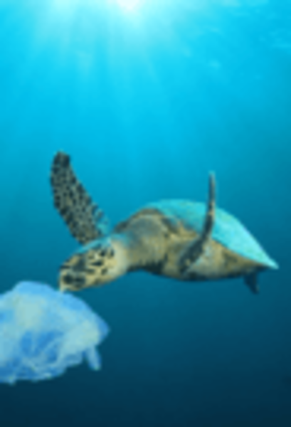 ウミガメがクラゲと間違えてプラスチックを食べている。